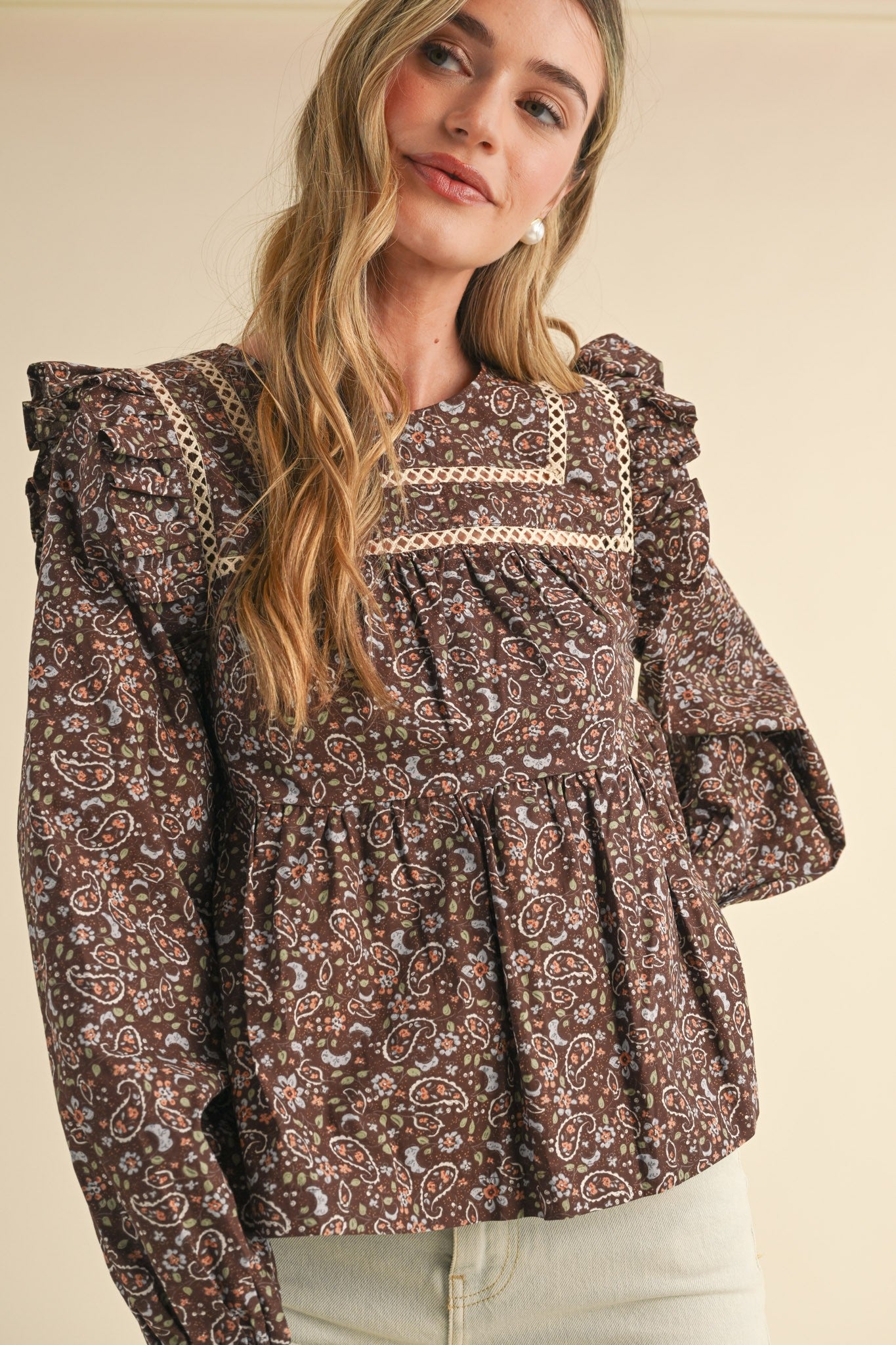 Cocoa Ruffle Puff Sleeve Lace Trim Top